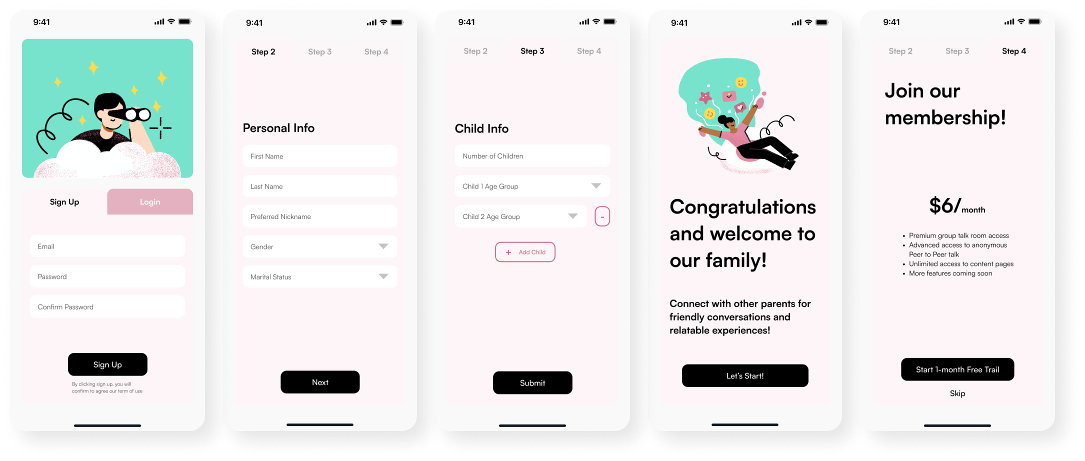 Onboarding: personal info → child ages → welcome to the community