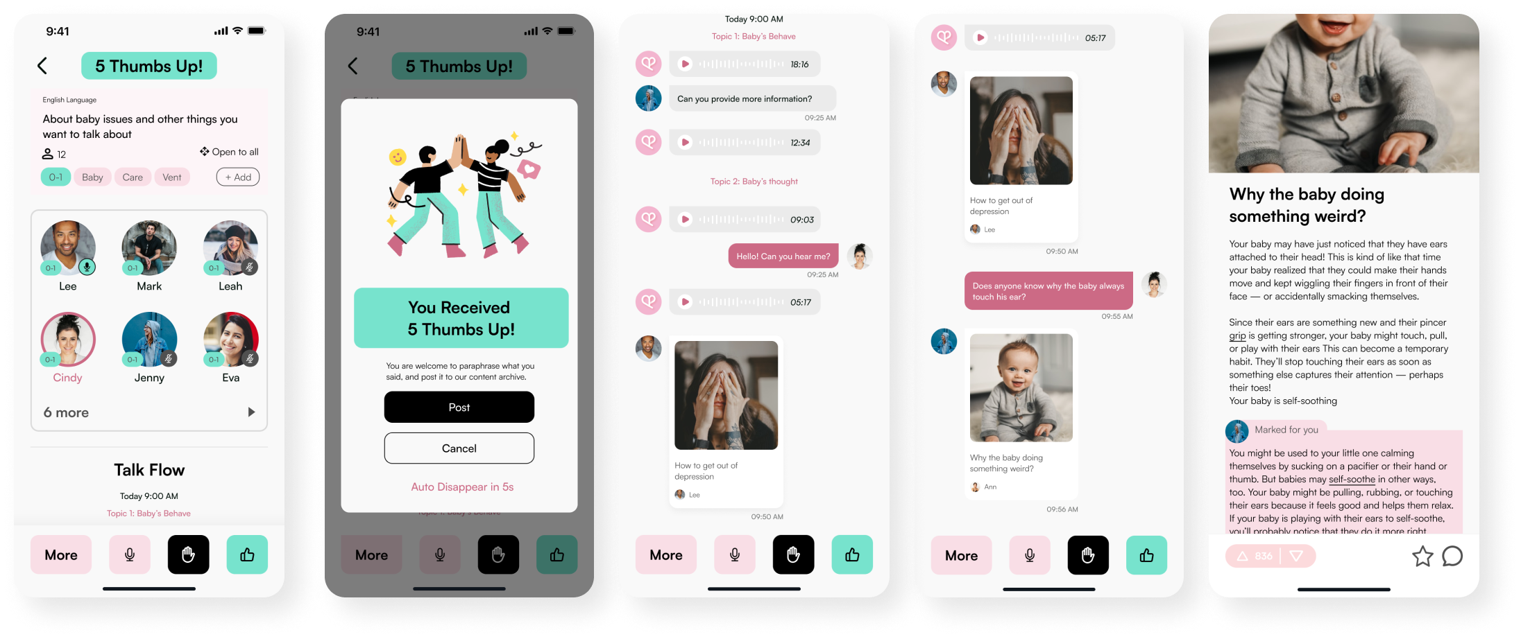 Topic-based rooms — sleep, partner tension, feeding — so parents find their people instantly. Open to all, no invite needed.