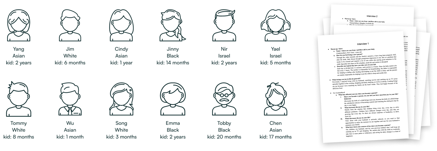 We interviewed 12 parents with diverse backgrounds — different ages, ethnicities, family structures, and children's ages. Two teammates were themselves new parents, which gave us genuine empathy alongside structured research.