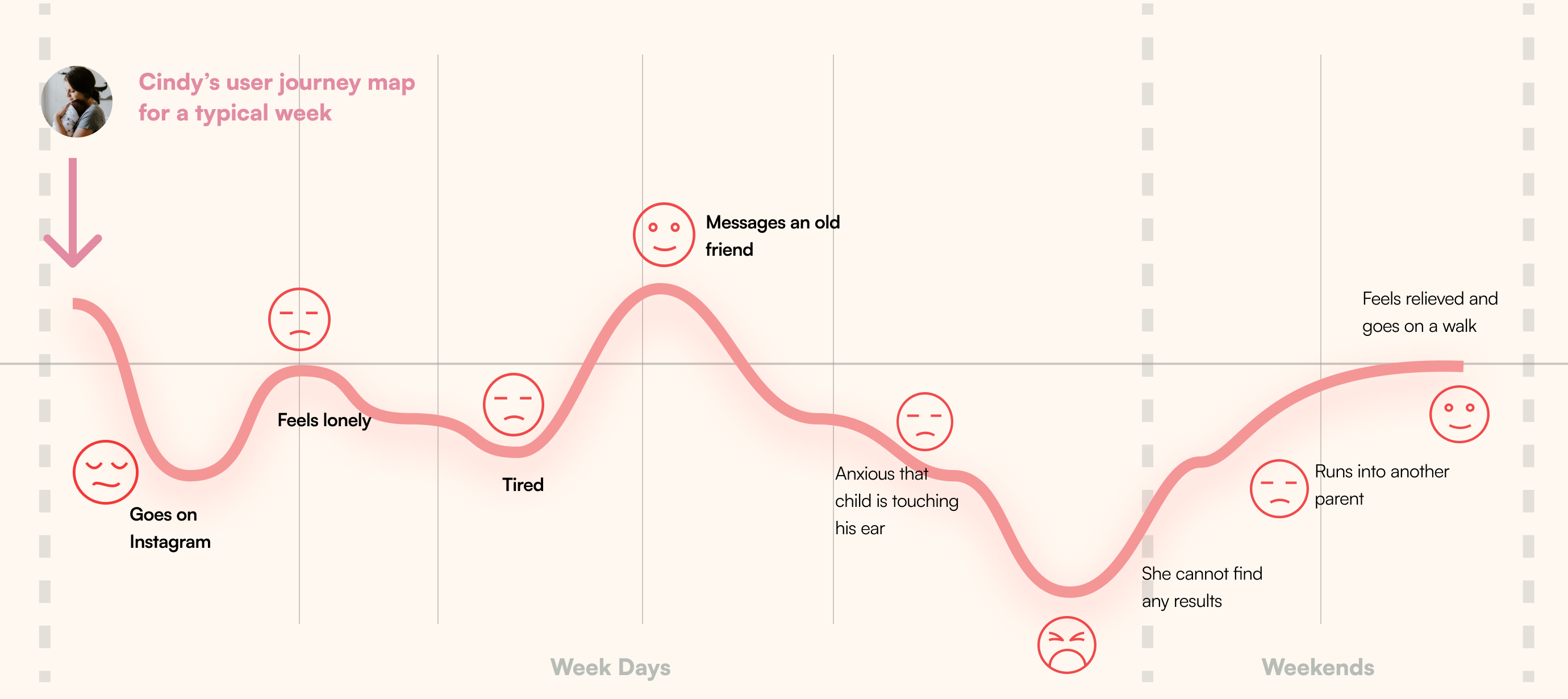 We built a journey map for our primary persona, Cindy — a 30-year-old new mom. Plotting her emotional state across a typical week made the pattern undeniable: the lows weren't about logistics. They were about loneliness.